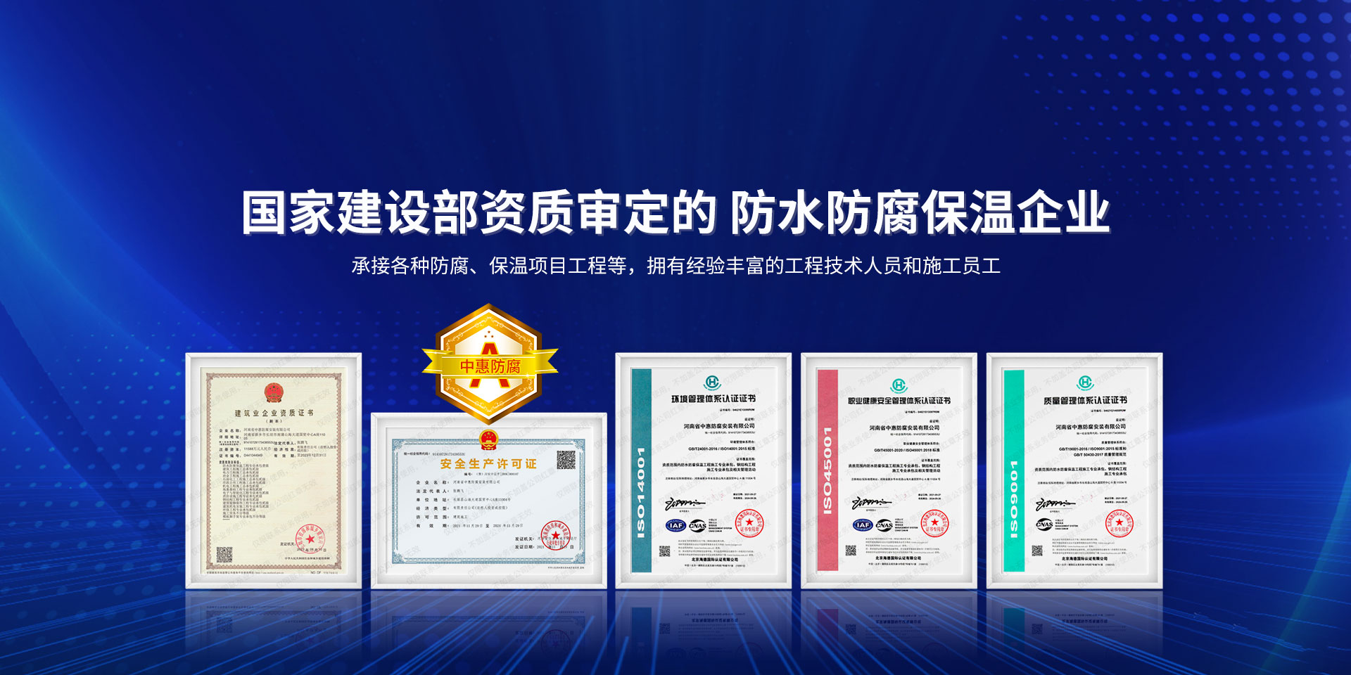公司經營范圍:防水防腐保溫工程;消防設施工程;建筑裝修裝飾工程;建筑機電安裝工程;電力工程;建筑工程;石油化工工程;工業清洗工程;油罐清洗工程;鋼結構工程;環保工程;模板腳手架工程;電纜防火封堵、防污閃噴涂、外墻外保溫工程;各類施工勞務作業;設備維修、船舶鉚焊、涂裝;電力工程材料、建材、防水材料、防火材料、防腐保溫材料銷售,并相繼通過了GB/T19001-2008idtISO9001:2008GB/T50430-2007質量管理體系認證證書。GB/T24001-2004idtISO14001:2004環境管理體系認證證書。GB/T28001-2011idtOHSAS18001:2007職業健康安全管理體系認證證書。公司是中國防腐蝕于防護協會、中國施工企業管理協會、電力協會和中國鋼結構防水協會會員單位。 公司的經營業務涵蓋了石油、化工、電力、冶金、煤炭、船舶、國防、燃氣、水利、環保、交通運輸、航空及國防軍工和輕紡市政等行業的防腐保溫絕熱設備。鋼結構安裝、防火、防水、金屬噴鍍、聚脲噴繪、陰極保護、防滲透堵漏、玻璃鋼及各種磚版材料襯里、橡膠襯里、煙氣硫和耐酸溶劑腐蝕等工程施工。公司連續十年榮獲“省市先進施工企業”“安全生產先進單位”“重合同,守信用企業”和“AA***資質企業”的稱號。2000年被命名為市級文明單位,2002年被國家工商行政管理局命名為“重合同,守信用的企業”、被中國工業防腐蝕技術協會命名為“防腐蝕企業,能源節約及環境保護領域有豐富的經驗和***的業績。工程一次交驗合格率100%。其中攀枝花鋼鐵公司煉鐵廠四號高爐及熱風爐防腐工程、上海寶鋼公司煤氣柜防腐工程、撫順石油一廠裝置防腐項目、齊魯石化公司稀烴廠高塔防腐工程、吉林化學工業公司煉油廠油罐防腐工程、天津石化熱電廠六號爐頂棚聯絡管保溫工程、大慶油田(太倉)力神泵業工程、中國化學工程第十一建設工程、中原油田勘探局工程、中國石化銷售有限公司華北分部、魯皖輸油管道工程、貴州開磷息烽合成氨工程、陜西黃陵煤化工程、中國石油天然氣西部管道塔里木輸油工程、邯鋼集團邯寶鋼鐵公司煉鐵工程、德州供電工程、吉寶(南通)船廠工程,偃師華潤熱力工程、鄭州熱力總公司。 河南省中惠防腐安裝有限公司愿以豐富的施工經驗,***的技術,***的設備,***的管理,***的服務,竭誠為國內外廣大的用戶提供***滿意、******的工程作品。 我公司愿與國內外同仁一道,團結協作,共同推進防腐蝕行業發展! 公司地址:河南省長垣縣建設路北段360號 固定電話:0373-8866488 郵編:453400 網址:http://www_zhff_com_cn.bjxrgg.com